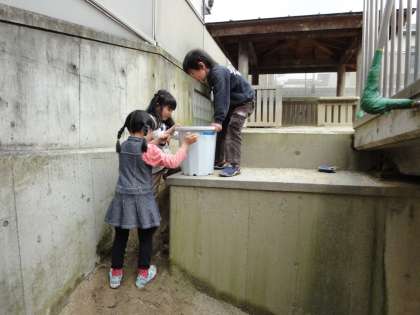 ケンガイ鉢いっぱいに雨で湿った土を入れて,2階まで運びました。でもとっても重くて一人で持つのは大変でした。困った子は,「○○くん,呼んでくるわ!」と友達を呼びに行きました。「手伝ってあげるわ!」と,率先して友達の手伝いをする子もいます。年長になり,仲間同士で助け合って生活しています。