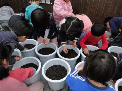 全員無事に2階の通路に鉢を運び,種を蒔くことができました。大きくなって,綿が取れたらいいですね。でも,綿ができるのは2学期。長い期間興味をもって育てるのはなかなか難しいことですが,年長だからこそ挑戦したいと思っています。