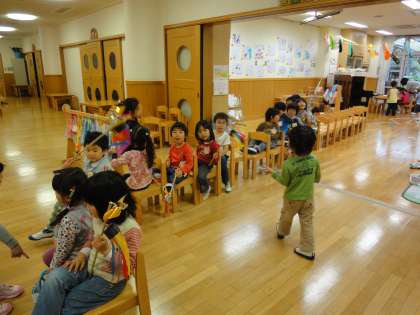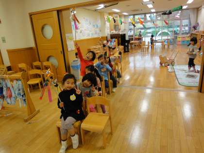 年中組が、参観日にお家の人と一緒に作った風車と吹き流しをもって遊んでいましたた。
