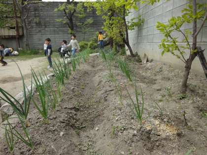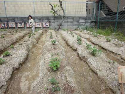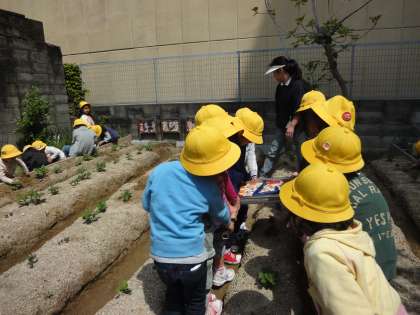 そして,以前に植えたタマネギとジャガイモの世話もしました。タマネギの畑は草がいっぱい生えていました。せっせと抜いて,「またおんぷちゃんとスキップちゃん(幼稚園で飼っているウコッケイ)におみやげにしよう」とあげることを楽しみにしている子どもたちもいました。