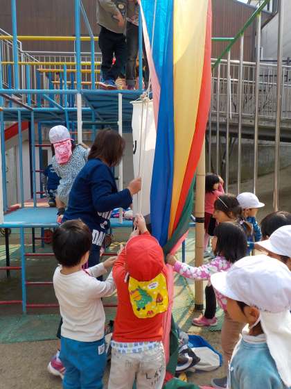 今日はやっと晴れました。園庭にこいのぼりを揚げました。今日は4歳児が先生と一緒に揚げてくれたのですが,とっても大きなこいのぼりなので,みんながすぐに集まってきました。
