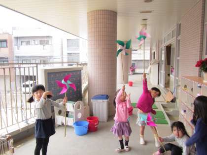 5歳児は,風車をつくりました。色も自分で選んで組み立てたので,より愛着がわきます。とっても大きい風車で,少し走るとよく回ります。走らなくても,風が吹くと回ります。