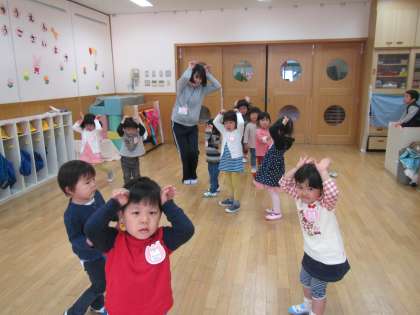 3歳児の子どもたちは,部屋で「かわいいかくれんぼ」の歌に合わせて,かわいく踊っています。「もう一回したい!」と,踊ることをとっても楽しみにしています。また明日,踊ろうね。