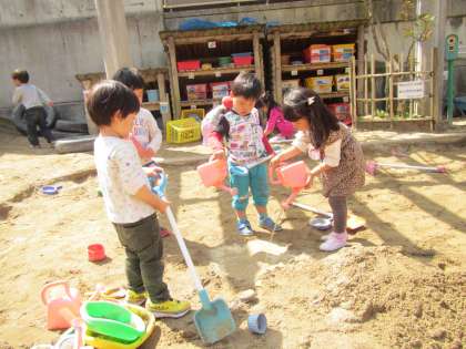 大きい組さんがジョーロを使っているのを見て,使ってみたくなりました。するとどんどん水たまりが大きくなって,そしたらもっと楽しくなってきました。