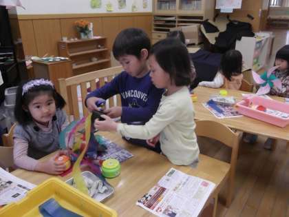 5歳児なったからこそ扱える素材に出会って欲しい思いがあり,今回は硫酸紙という特別な紙をつかうことにしました。薄い破れやすい紙ですが,少し透けた感じのするので,吹き流し用の硫酸紙を受け取ると重ね合わて色の変化を喜んだり友達と見せ合ったりして楽しむ姿も見られました。