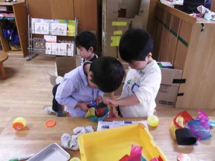 お部屋から見える幼稚園の大きな鯉のぼりとともに泳ぐ吹き流しに気がついた子どもたち。「きれいな色!つくってみたい!」と声があがり,さっそく次の日に準備をしてみんなで吹き流しをつくることになりました。