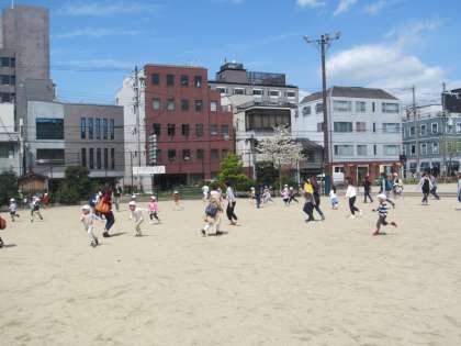 5歳児は,おうちの人に参加してもらって,竹間公園で帽子取りで走り回りました。