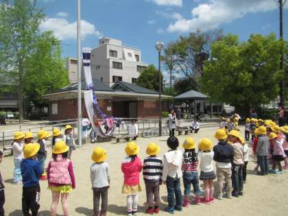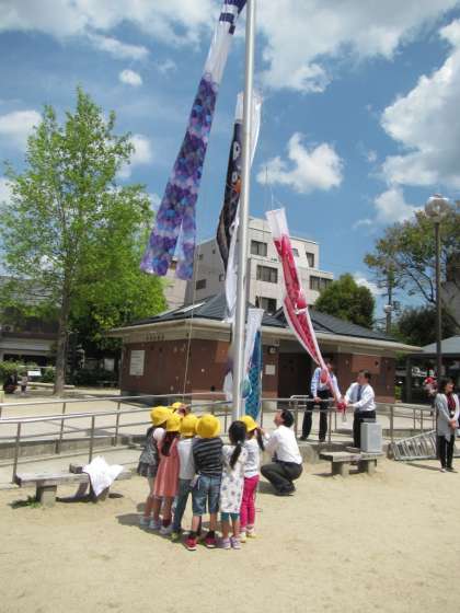 参観の後は,竹間公園にて鯉のぼりの掲揚式がありました。大きなぴかぴかの鯉のぼりを子どもたちの手であげて,♪こいのぼりの歌をみんなで歌いました。