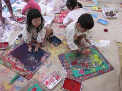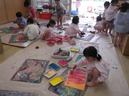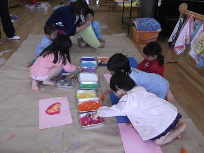 たんぽぽ組とひまわり組の保育室では,絵の具遊びを楽しむ子どもたちの姿がありました。