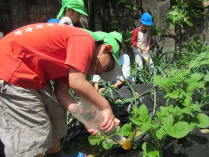 4歳児の時に植えた玉ねぎとじゃがいもの様子を見てきました。植えた時と比べて大きく成長していることに子ども達は喜んでいました。たくさんの草が生えていたので畑の草をみんなで抜きました。そして日照りの日が続いていたのでみんなでペットボトルに水を汲んでたっぷりのお水を元気に育ってねの気持ちであげました。