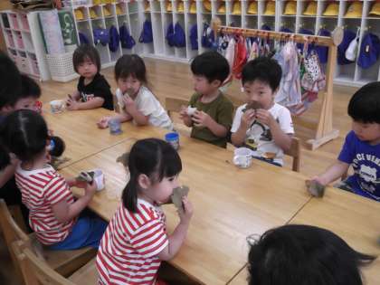 3歳児は各クラスで「おいしいね」と言いながら柏餅を頂き,鯉のぼりの紙芝居や絵本を見ました。