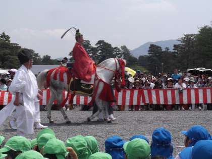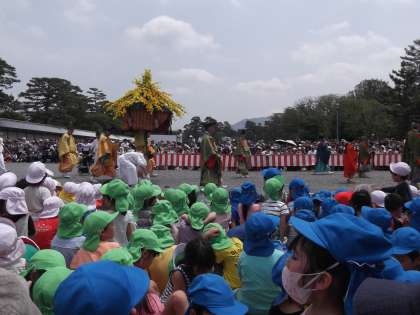 10時30分,お祭りの行列が動き出しました。この場所は行列の先頭からみられる特等席です。教育委員会のご厚意で,子どもたちのために観覧席を用意してくださっているものです。馬や牛,昔の装束に身を包んだ人々の行列が子どもたちの前を通り過ぎていきます。珍しいものが通ると子どもたちから歓声があがります。大きなきれいな花笠をもった人には「力持ちやな」と感心していました。そしてとうとう斎王代の登場です。子どもたちは大きな拍手をして大喜び!
