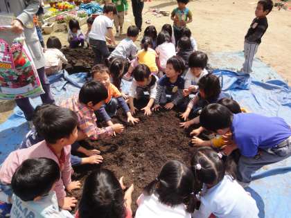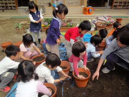 久しぶりに顔を出したお日様に見守られながら、4歳児が土づくり、ミニトマトの種まきをしました。
