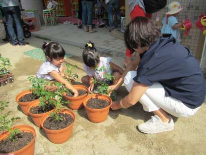 3歳児はミニトマトを親子で植えました。初めての栽培活動。野菜がおいしく育つように栄養満点の土をつくろうと子どもたちと肥料を混ぜながら,土づくりから始めました。土を混ぜながら,「ミックスジュースしよう」と混ぜ合わせるとフカフカの土になりました。最近の子どもたちは土の感触に触れる機会が少なくなりましたが,とても貴重な経験です。