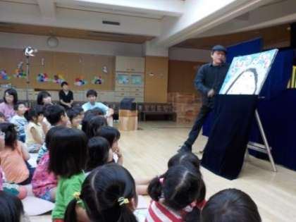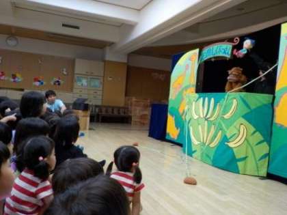 人形劇団「らせんくらぶ」さんに来ていただき,紙芝居「おむすびころりん」と人形劇「ごりごりごりくん」を見せていただきました。人形劇ではあら不思議,ごりくんの大好きなバナナが登場すると会場中にバナナの香りが漂い,みんなもバナナを食べたくなる気分になりました。ごりくんがジャングル植物園に行くと,会場にも森の香りが漂い,よりイメージを広げながら人形劇を楽しむことができました。幼稚園参観に来てくれていた未就園児の皆さんも一緒に楽しむことができたようです。