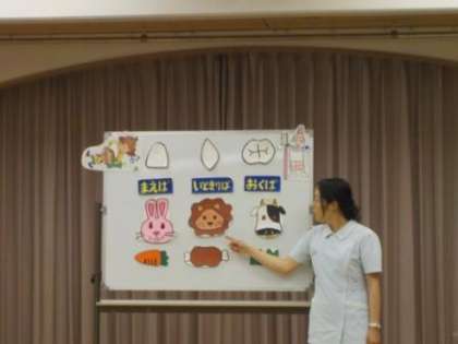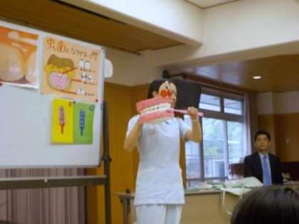 歯ブラシには顔があり,表がお腹,後ろが背中で“こんにちは”の持ち方と“さようなら”の持ち方があることや,ブラッシングの仕方,歯ブラシの交換の時期などについても教えていただきました。