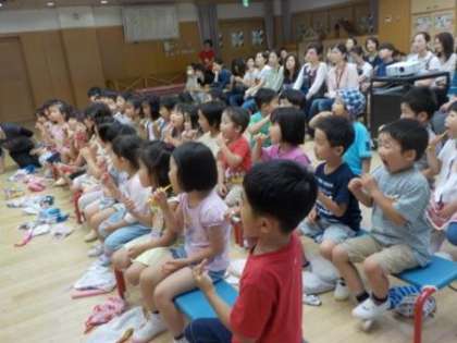 子どもたちは歯ブラシを持ちながら,曲に合わせて,前歯や奥歯など歯のすみずみまで歯磨きをしました。