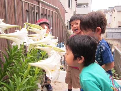 3歳児は恐竜になって園内を探検することを楽しんでいます。今日も築山の上の家でご飯を食べようと飛びながら向かっていると,その途中にユリの花がたくさん咲いているのを見つけ,「いいにおいする」と花に顔を近づけて見ていました。