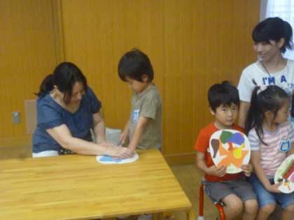 子どもたちはこの日を楽しみにしていたようで,地域の方の姿が見えると「きはったぁ!!!」と嬉しそうな子どもたち。子どもたちの前で,おもちでつくった糊をこねながら,いい匂いの杉の木でできた柄を手際よく子どもたちの作品につけていってくださいました。できた自分のうちわを愛おしそうに眺めたり,ちょっと扇いでみたり。