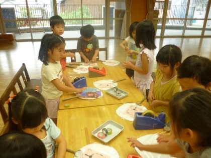 そこで,子どもたちも無地のうちわをいただいて,そこに和紙を切って,貼り絵をつくり自分のうちわをつくりました。のりを乾かして,再度地域の方にお預けをして,5日間ほど押しをしっかりかけていただき,今日幼稚園で柄をつけて完成させるためにまた持ってきていただきました。