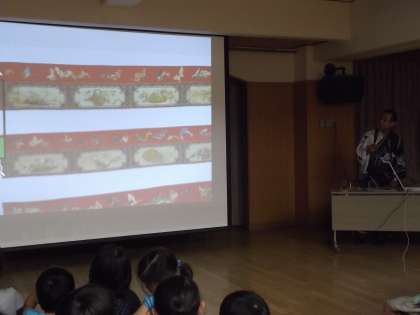 おはやしの鉦を演奏し,音色を聴かせてもらったり,祇園祭ではキュウリをなぜ食べないのかについてや,鉾の一つ一つに動物が彫られていることなどを教えていただきました。子どもたちはとても真剣に聞いていました。