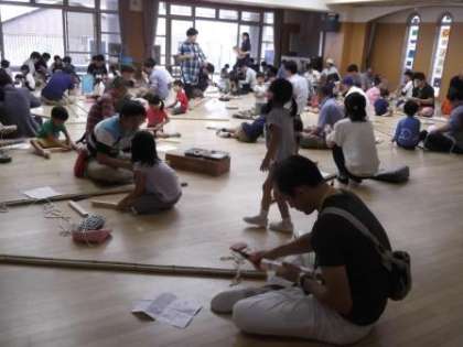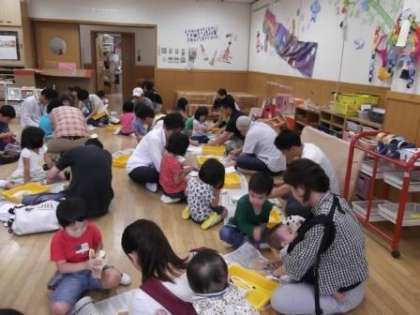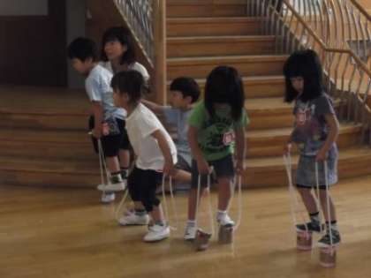 今日は日曜参観日です。お家の人と一緒に登園した子どもたち。お家の人と一緒に触れ合い遊びを楽しんだり,3歳児は竹ぽっくりを,4歳児は一本歯下駄を,5歳児は竹馬をつくってもらったりして半日楽しみました。つくってもらった竹ぽっくり,一本歯下駄,竹馬にさっそく挑戦し始める子どもたちをお家の方が温かくサポートしてくださっていました。お家の人と楽しんでつくったので,これから大事に遊んでいきたいと思います。