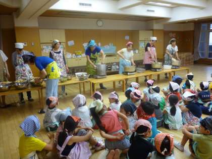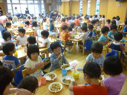 だんだんおいしそうな匂いがしてきて,遊戯室に3学年皆が集まりました。