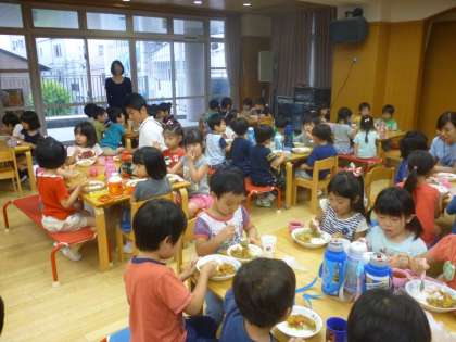 3,4,5歳児みんな集まって朝からたくさんお手伝いをしてくださったPTAの方にありがとうの気持ちを伝え,一緒に「いただきます」をしてカレーを頂きました。