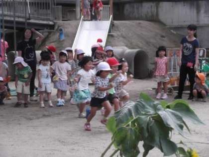 4歳児は園庭でかけっこや体操をしました。かけっこをしていると子どもたちから「もう一回!」という声が何度も聞こえ、先生たちも子どもたちと一緒に汗を流しながらかけっこを楽しみました。