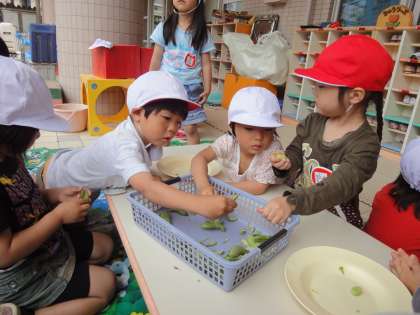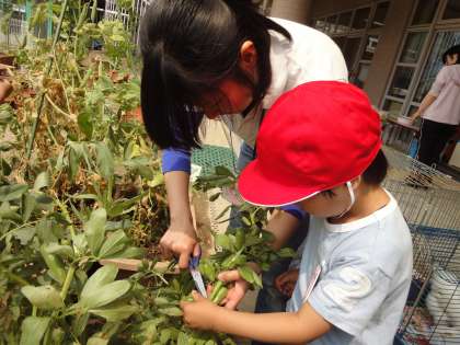 きれいな黄緑色のソラマメを見て「これどうするの?」「食べるの?」と収穫の次の楽しみを知っている子どもたちの表情は生き生きとしています。