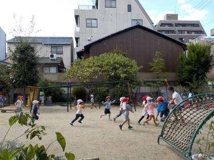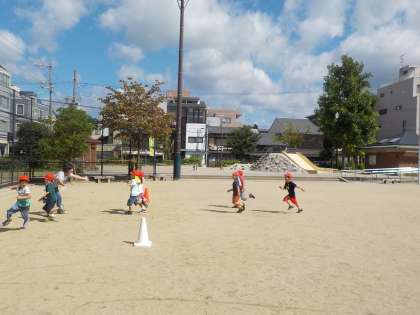 今日は,4歳児は竹間公園に走りに行ったので,3歳児だけで「よーいどん!」をしました。何回も走る子,友達が走る様子を見ている子など,いろいろな参加の方法で「よーいどん!」を楽しんでいます。