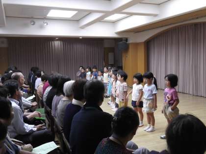 一緒に遊んだあとは,遊戯室でクラスごとに歌や手遊びやダンスを見てもらいました。