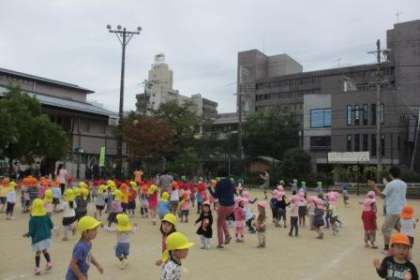 午後からは雨がパラパラ降ってきましたが、5歳児の子どもたちは幼稚園の中で綱引きをして遊びました。掛け声は4歳児、3歳児のお部屋にも聞こえてくるほど大きな声で、綱を一生懸命引っ張る5歳児の子どもを、近くにいた4歳児、3歳児の子どもたちは「すごいね」と言いながら食入るように見入っていました。