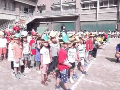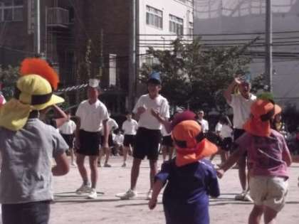 今日4歳の子どもたちは,御池中学校で行われた御池フェスティバルに出かけ,中学生のお兄さん,お姉さんと一緒に「園児とともにGOGO」に参加しました。中学校に向かう道中では,子どもたちの姿からとてもワクワクしているのが伝わってきました。