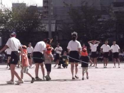 中学校に到着すると100メートル走の最中でした。座って100メートル走を見学していたのですが,「速いね!」「お兄さんもお姉さんもおっきいね」と驚きの声が上がりました。昨日延期になった分,楽しみが大きかったのか「一緒にするのまだ?」という声もたくさん聞こえてきました。