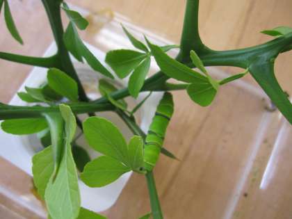 保育室でアゲハを育てています。園庭のみかんの木の出番です。なかなか実はならないのですが、毎年アゲハが卵を産みに来ています。隣にある枳殻の木にもアゲハが来ます。それぞれ食草としては十分で、黄色い卵を見つけて保育室で飼育しています。脱皮を繰り返しながら生長する中で、さなぎが保育室の意外な場所で見つかったりもします。そんな時は糸を切らないように注意して見守っています。もう直ぐ保育室に蝶が舞うようになるでしょうね。