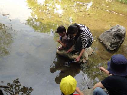 さぁ,ザリガニ釣りに挑戦中!エサのスルメでザリガニをおびき寄せて・・・「あっ,あそこにいる!」でも,ザリガニもつかまるまいとして,必死で逃げています!なかなか難しかったけど,みんなで歓声をあげながら楽しみました!