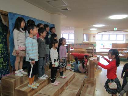 ステージごっこでも,幼稚園大会で歌った歌をステージのお客さんに聞いてもらうような姿もありました。