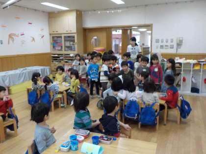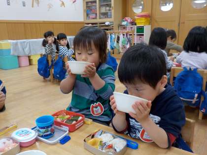 3歳児はお弁当の準備が出来たころにお兄さん・お姉さんたちが持ってきてくれました。いつもと違いお弁当にお味噌汁が付いて子どもたちはとても嬉しそうで「美味しいな」「さつまいもはいってるで」といつも以上に会話が弾んでいました。美味しいあまり3歳児ではお代りをする子どもたちもいました。