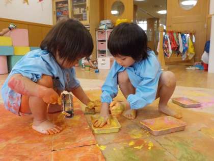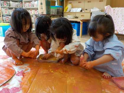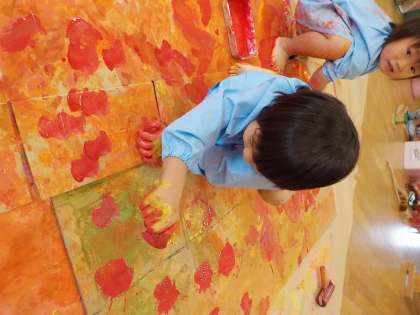 赤,ピンク,黄色,オレンジ,黄緑などたくさんの色を使って遊びました。初めは好きな色から始めます。そこから絵具を付け手形を付けたり,友達の絵具が自分のと重なることを楽しんだり,トレーから直接段ボールに流しその上で足を滑らせてみたり,ローラーに絵具をつけて転がせてみたり,スポンジにたくさん絵具をしみこませてスタンプのようにしたりと面白いことを子どもたち同士で考えてしている姿は,見ている方も楽しくなります。友達と一緒にすることを楽しむ子どもや自分一人でじっくり絵具を楽しむなど子どもたち一人一人違う姿見られます。スモックにいっぱい絵具が付いているのはじっくり遊んだ証拠。そんなスモックをいつもきれいにお洗濯してくださってありがとうございます。