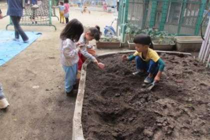 4歳児の子どもたちは砂場で、砂と水を混ぜてチョコレートを作り、チョコレート工場をして遊んだり、鉄棒、うんていをして遊びました。また、自分の鉢に植えていた大根を抜き、玉ねぎの苗を植えました。大根を抜いた子どもたちは「大っきいで!」「すごいなぁ!」と自分で育てた大根の成長を喜んでいました。