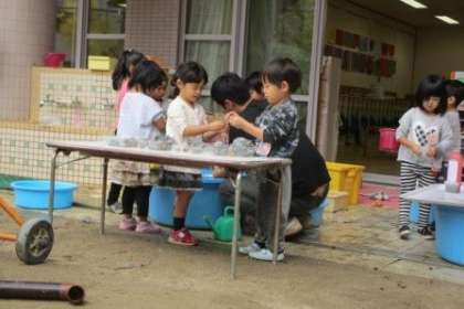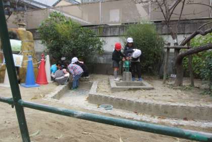 空は雲が多く「雨降らへんかなぁ」と天気を気にする子どもの姿もありましたが、天気を気にしながらも元気よく三輪車に乗ったり、泥だんごを作ったりして園庭で遊びました。3歳児の子どもたちは、テラスに出て新聞紙と落ち葉を水で混ぜ“だんご”を作って、前を通る子どもに「おだんごです」「おだんごどうですか」と作っただんごを売って、だんご屋さんを楽しんだり、2人乗りの三輪車に友達と乗り、電車やバスになりきって楽しみました。