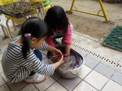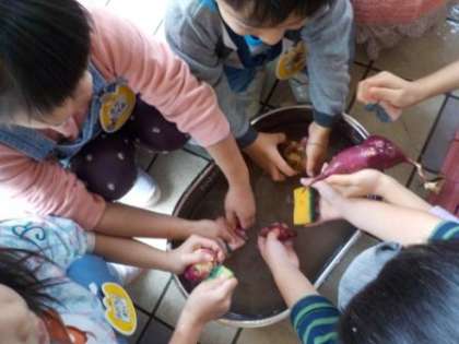まずは,たわしやスポンジを使って土をとり,洗いました。1つのサツマイモを一生懸命,丁寧に洗っていました。子どもたち同士で「まだ土とれるで!」「こんなにきれいになった」と会話も楽しみながらサツマイモを洗っていました。洗ったサツマイモはふかしイモに,サツマイモのツルはおひたしにして,お弁当の時に食べました。ふかしイモもツルのおひたしも「おいしい!」「もっと食べたい!」と喜んで食べていました。