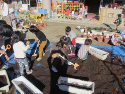 3歳児の子どもたちは、プランターに入れるための土を自分たちで混ぜてお花を植えました。大きなスコップや、くまでを上手に動かし楽しんでいました。
