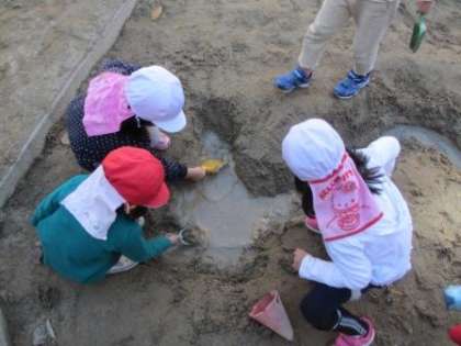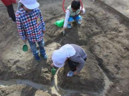 4歳児はうんていや、砂場など園庭に出て元気に遊ぶ姿が見られました。砂場ではスコップを使って砂を掘り、「大きい川作ろう!」と、友達と相談しながら川を作っていました。また、川を作りながら、「川の近くには山があるで!」「川は深く掘らな水がこぼれてしまう!」など自分たちで川のイメージをふくらまし、友達とイメージを共有しながら川作りを楽しんでいました。