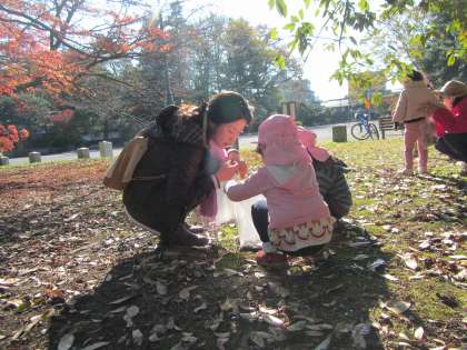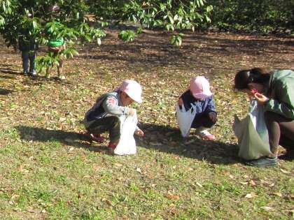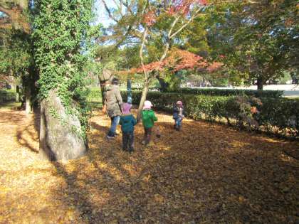 御苑で遊ぶと,子どもたちはいろいろな物を発見します。きのこ,銀杏,木の穴などなど・・・。一つ一つに興味を持って,心を動かしていました。