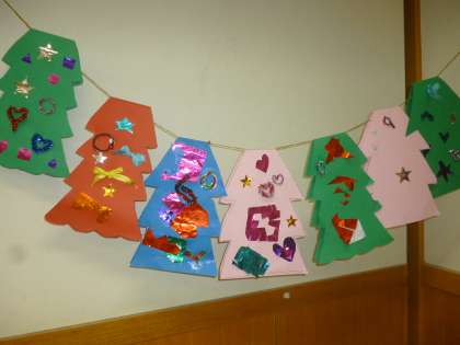 5歳児はツリー型のカバンで立体をつくる経験をしたいと思っています。リボンを蝶々結びにしたり,モールをねじって貼ったり,ひとつひとつの飾りにもこだわってつくっています。