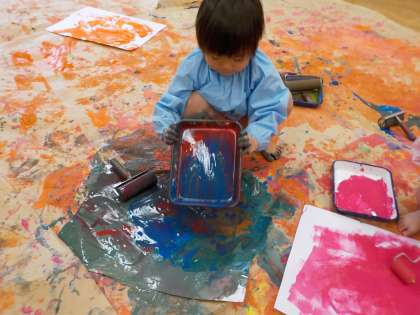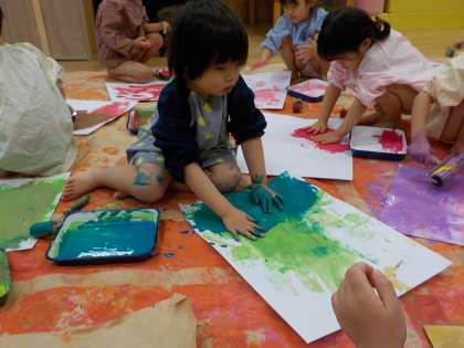 初めは指に絵具を付けてスタンプみたいにして遊んでいましたが,そこから手のひらに付けて画用紙に塗りました。初めは一色だったのがいろんな色を混ぜることでマーブルのようになったり,不思議な色になったりと子どもたちは絵具の感触や色が混ざることを楽しんでいる様子でした。