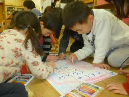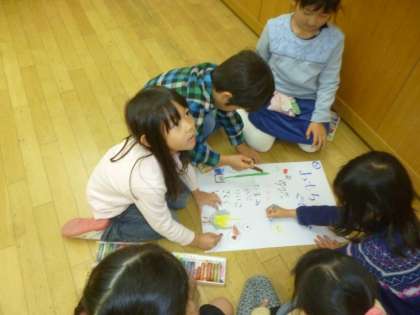 みんなの名前がかいてあるグループ表を,互いに相談をしながらかきました。その表にどんなものをかくのか,どこにかくのかをみんなとやり取りしながら役割分担してかいていきました。グループの名前にちなんで絵をかくところもあれば,自分たちの好きな動物や食べ物をかくところもありました。