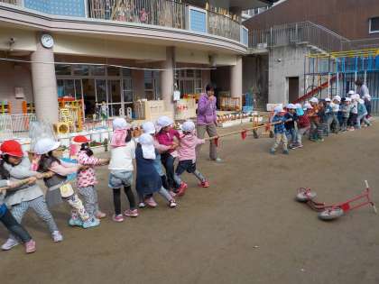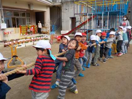また,園庭ではおにごっこをしたり,年中組が綱引きをしたりして遊んでいます。おにごっこでは1階だけでなく,2階やグルグル滑り台を使っておにから逃げます。